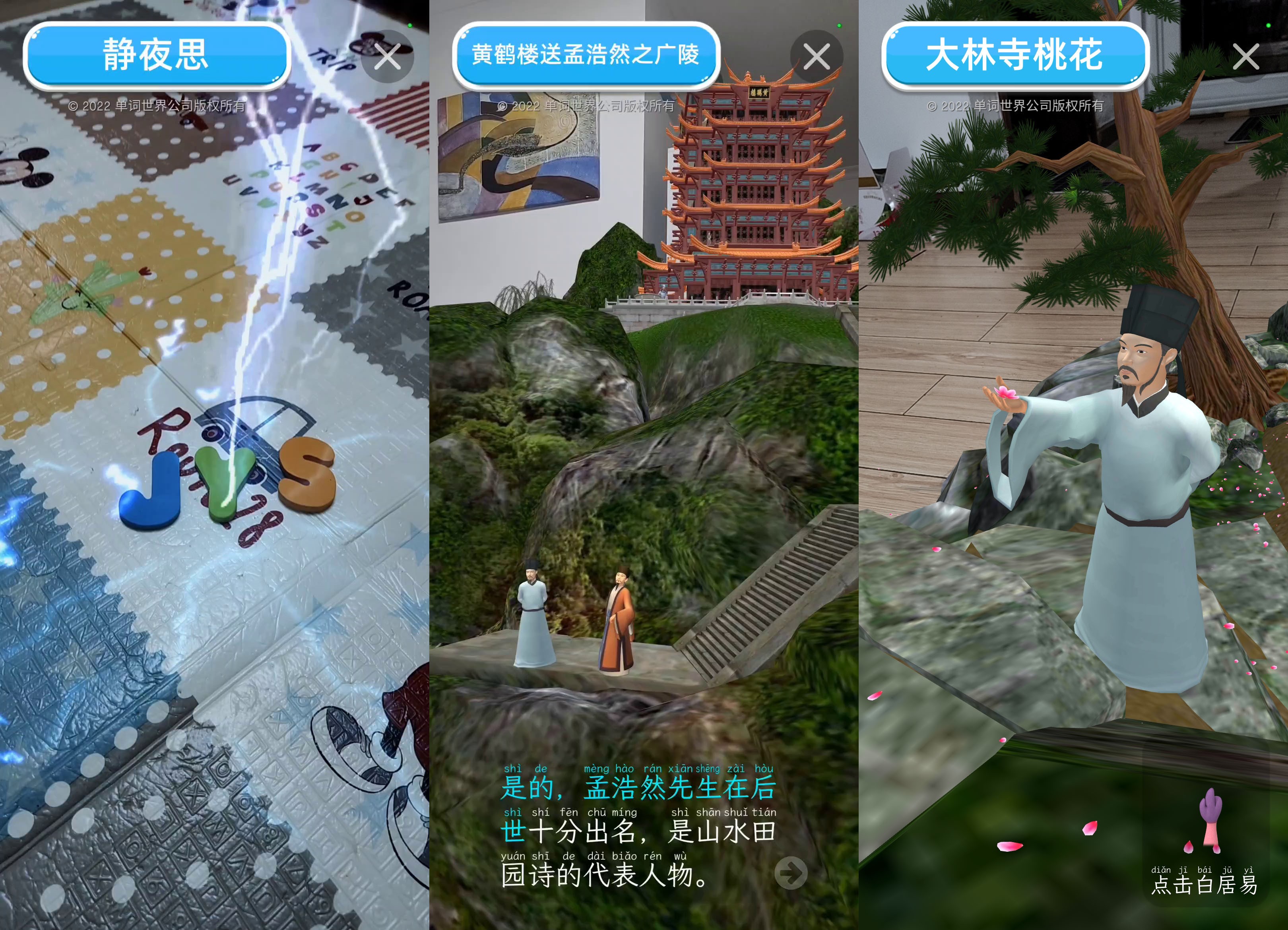 通过极致的视听体验让用户仿佛置身于另一个世界,祖国的瑰丽风貌,奇伟建筑立现眼前。不仅强化了用户对古诗词的理解,还能带动其对传统文化的学习兴趣。了解古代文化知识,体会传统文化魅力。讲好中国故事,实现文化自信,用科技让学习更有趣。